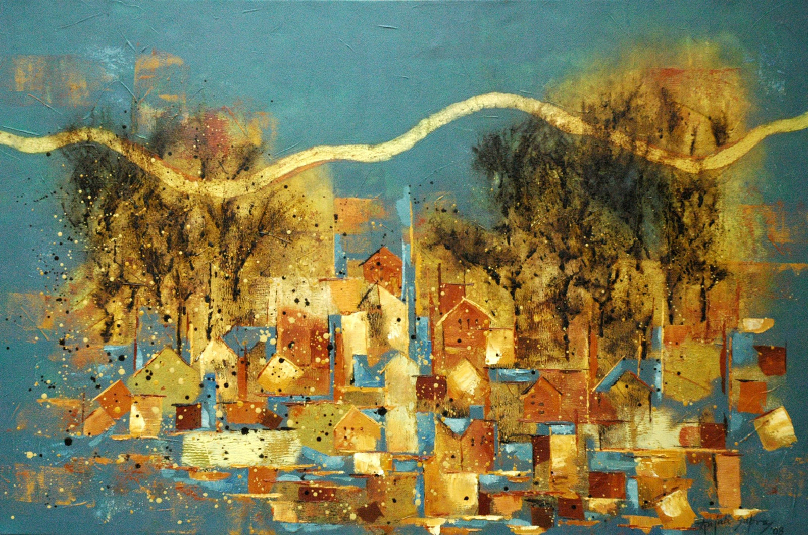 Rich colours play across the canvas creating contours and structures, shapes and shadows while heavy texturing lends a multilayered quality.