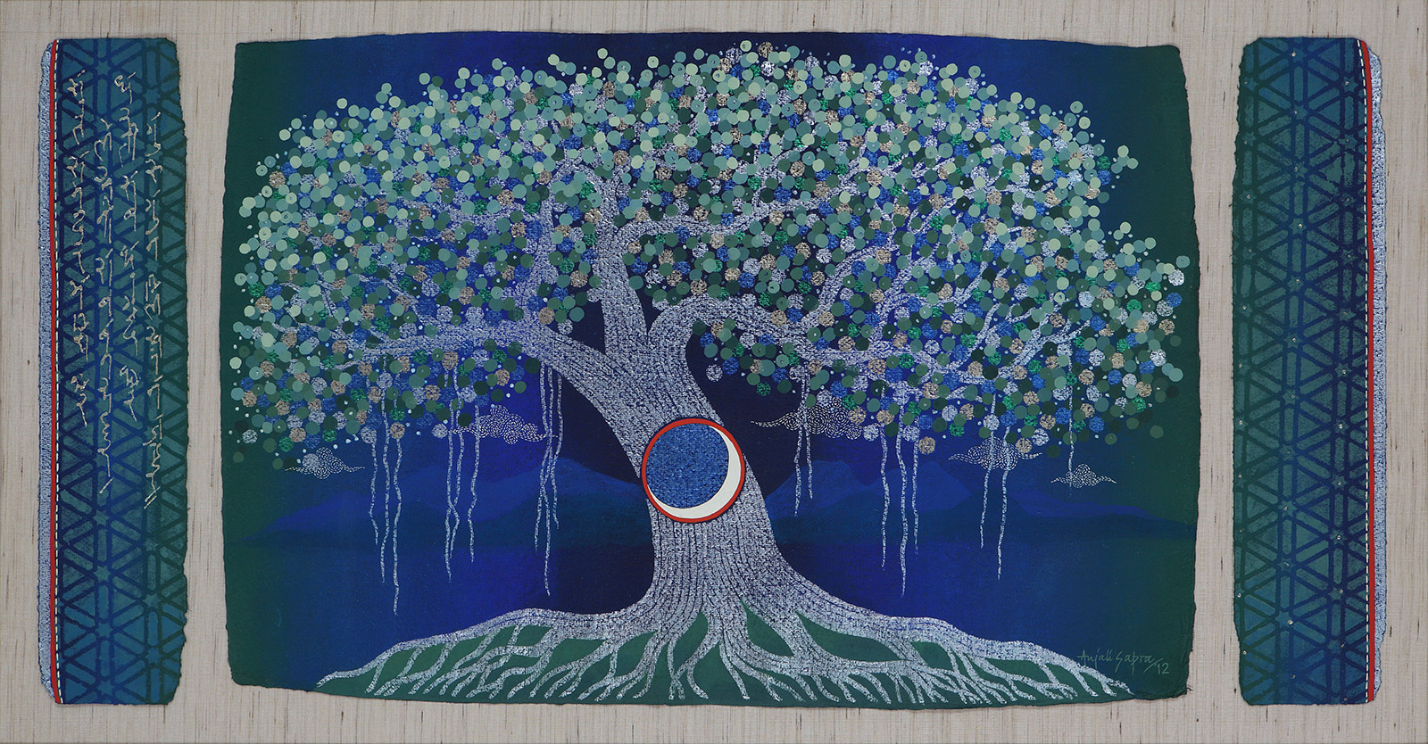 The series “Elemental Spaces” has been conceived as a visual rendering of natural elements combined with metaphors and symbols from mythology and religion. The banyan tree, a symbol for earth, signifying stability and immortality, images of life giving warmth and energy; the river, flowing unidirectionally like time and life; all pervasive air and all encompassing ether; the five elements combine harmoniously to provide a divine landscape of joyous celebration.
