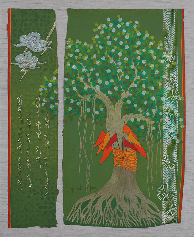 The series “Elemental Spaces” has been conceived as a visual rendering of natural elements combined with metaphors and symbols from mythology and religion. The banyan tree, a symbol for earth, signifying stability and immortality, images of life giving warmth and energy; the river, flowing unidirectionally like time and life; all pervasive air and all encompassing ether; the five elements combine harmoniously to provide a divine landscape of joyous celebration.
