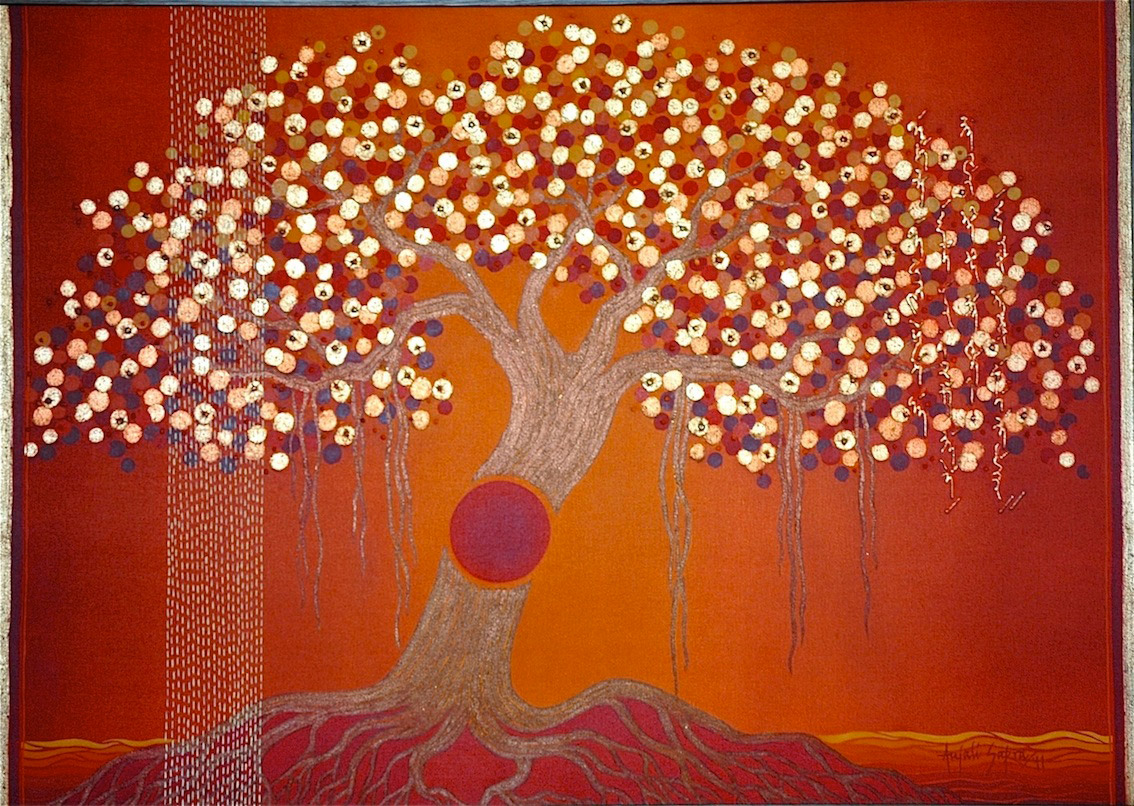 The series “Elemental Spaces” has been conceived as a visual rendering of natural elements combined with metaphors and symbols from mythology and religion. The banyan tree, a symbol for earth, signifying  stability and immortality, images of life giving warmth and energy; the river, flowing unidirectionally like time and life; all pervasive air and all encompassing  ether; the five elements combine harmoniously to provide a divine landscape of  joyous celebration.