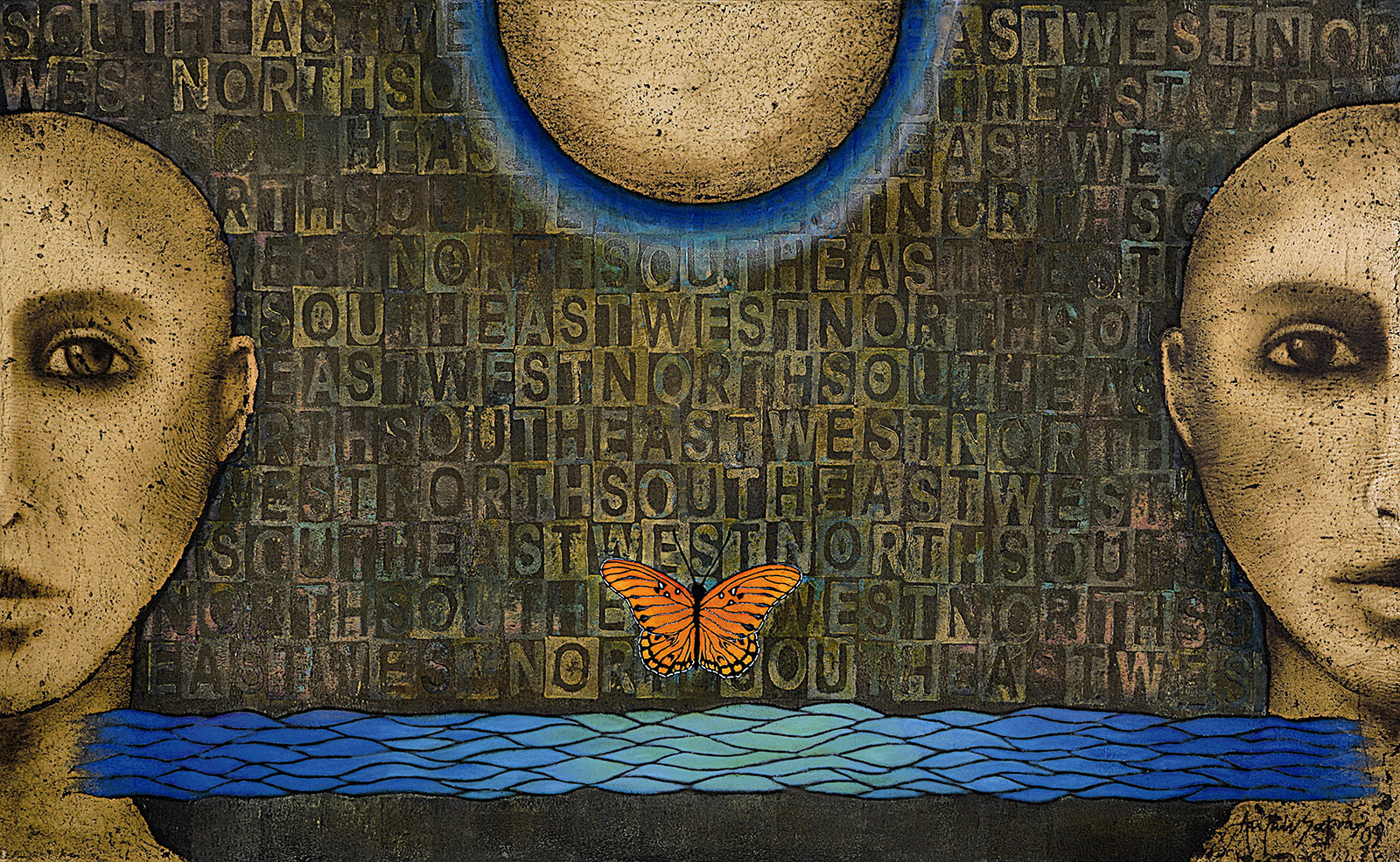 The series “The Ephemeral Playground” attempts an insight into this subject. Tranquil, contemplative, inquiring or somber, these faces, enclosed within window-like spaces look meditatively out from a canvas richly worked in the colours of life, imbued with potent symbols and metaphors conveying the transience of this world. An attempt is made to question and simultaneously provide answers to the meaning of life.