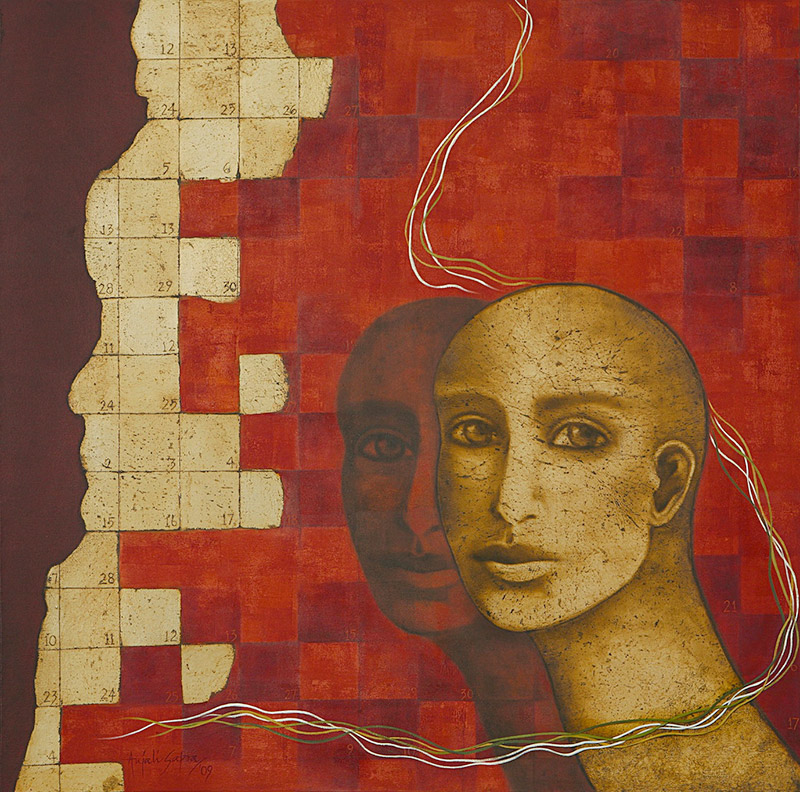 The series “The Ephemeral Playground” attempts an insight into this subject. Tranquil, contemplative, inquiring or somber, these faces, enclosed within window-like spaces look meditatively out from a canvas richly worked in the colours of life, imbued with potent symbols and metaphors conveying the transience of this world. An attempt is made to question and simultaneously provide answers to the meaning of life.