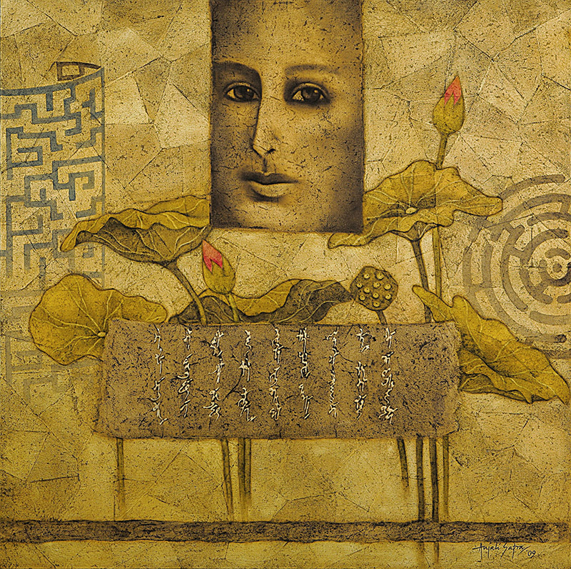 The series “The Ephemeral Playground” attempts an insight into this subject. Tranquil, contemplative, inquiring or somber, these faces, enclosed within window-like spaces look meditatively out from a canvas richly worked in the colours of life, imbued with potent symbols and metaphors conveying the transience of this world. An attempt is made to question and simultaneously provide answers to the meaning of life.