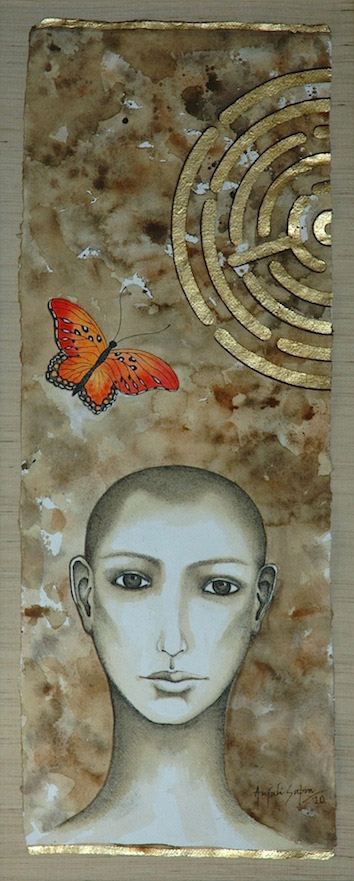 The series “The Ephemeral Playground” attempts an insight into this subject. Tranquil, contemplative, inquiring or somber, these faces, enclosed within window-like spaces look meditatively out from a canvas richly worked in the colours of life, imbued with potent symbols and metaphors conveying the transience of this world. An attempt is made to question and simultaneously provide answers to the meaning of life.