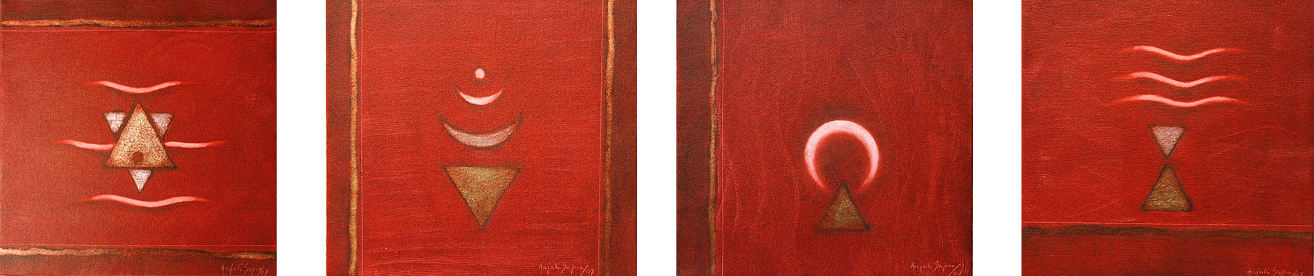 This series draws inspiration from ancient Indian philosophy and the importance of the five elements. The corporeal body, according to Ayurveda, is composed of five elements- Earth, Water, Fire, Air and Ether. When complete balance is attained between these, the body and mind achieve the ideal state. This leads the human spirit to life and hope, to emotional equilibrium and ultimately to the Supreme Being.
