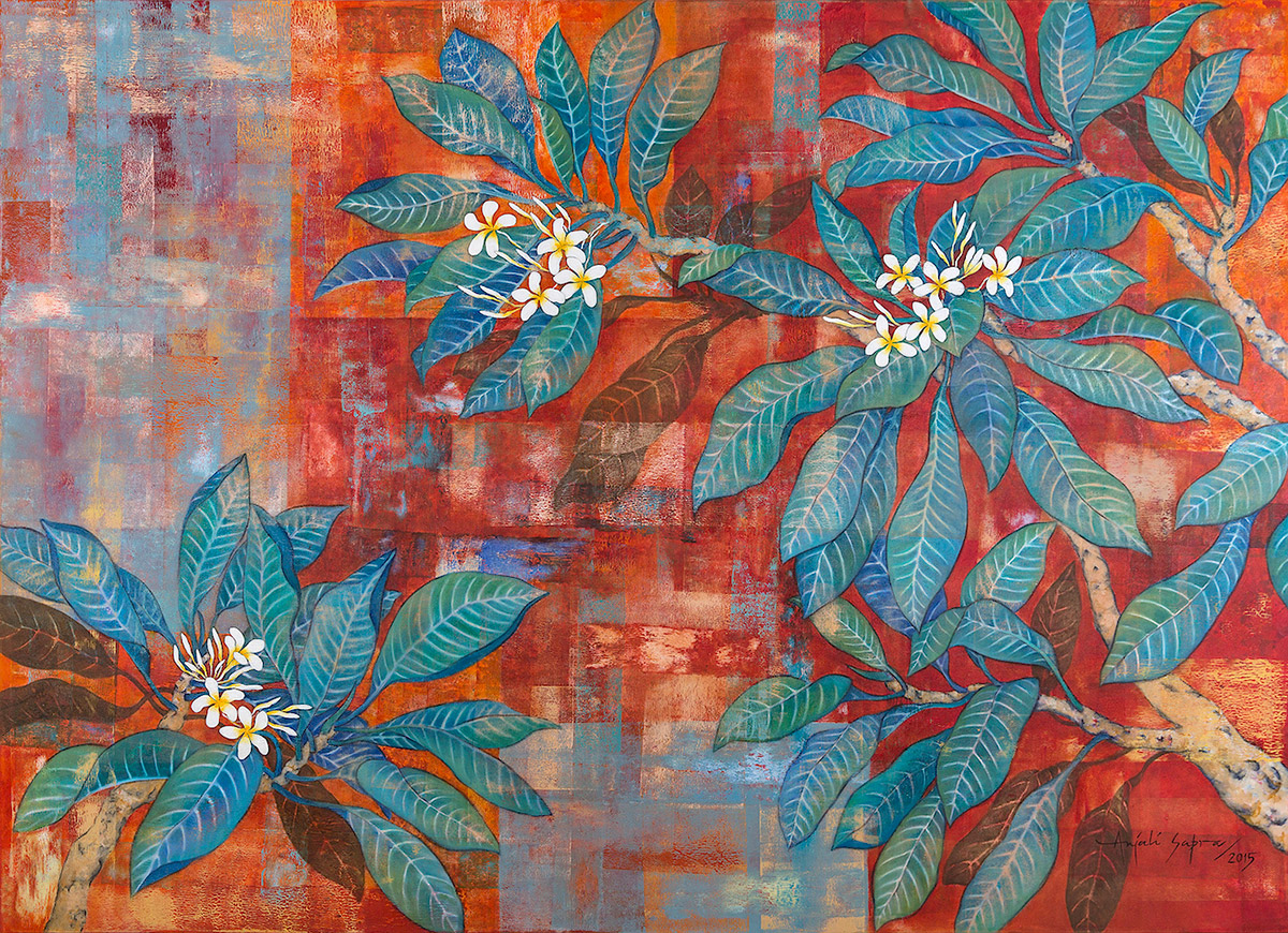 An innate connection with nature formed by a childhood spent in lush verdant spaces finds expression in this vibrant series. Sensuous Frangipani languorously blossom; exuberant Ficus stretch across a multihued canvas and provide a landscape into which one can retreat and renew oneself.